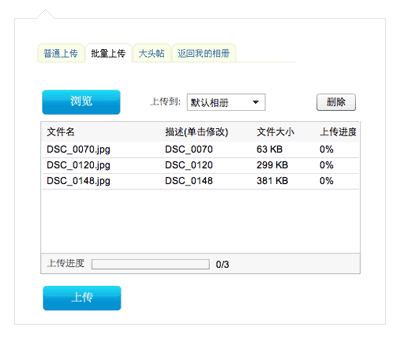 可以非常方便的批量上传自己的图片,也可进行大头贴拍照。